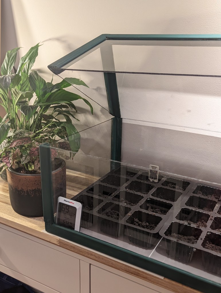 Last year, I made a seed propagator in the shape of a miniature greenhouse. It’s about 40 x 20 x 30 cm (L x W x H) in size and perfectly fits two trays of seedlings.