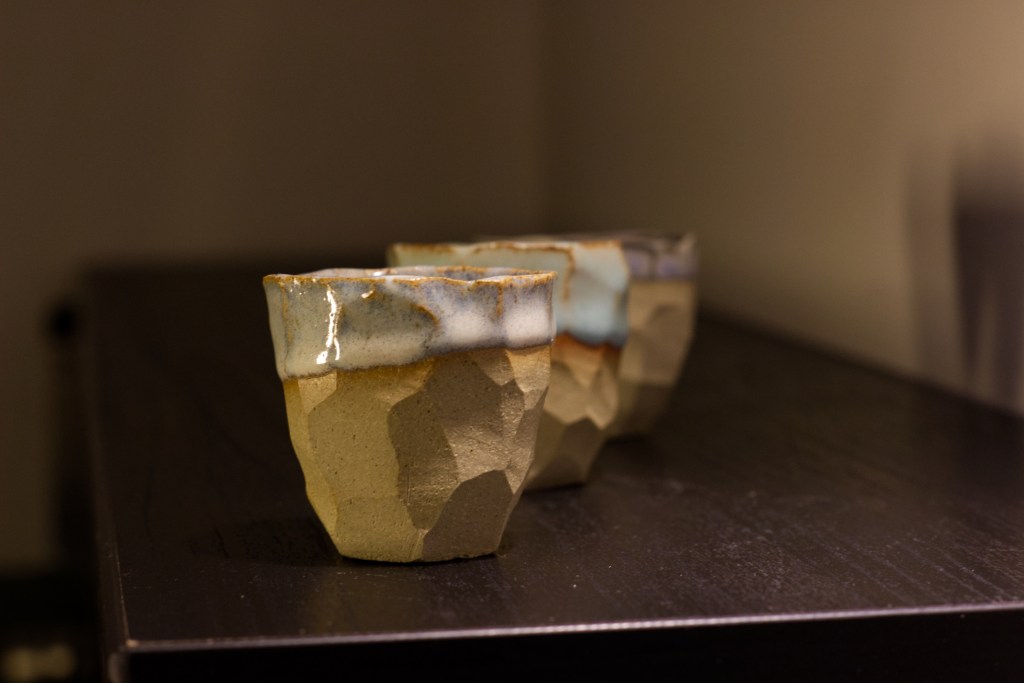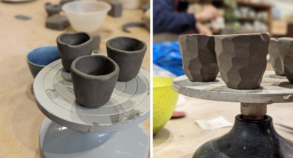 I decided to make espresso mugs using a Kurinoki carving technique. I made a small pinch pot of 4-5 mm thick, and once it was leather-hard I carved an angular texture on the outside with a knife. I love how the sharp angles catch the light and nearly make the pot look like chiselled stone.