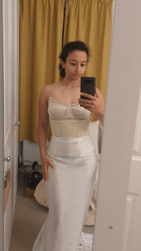 I started the design process in March 2024, which gave me about 16 months to complete the project. My starting point was trying on dresses in a shop, which was incredibly helpful because you don’t know how you really feel in a dress until it is on your body. I booked an appointment in London and went with my mum and two maids of honour.