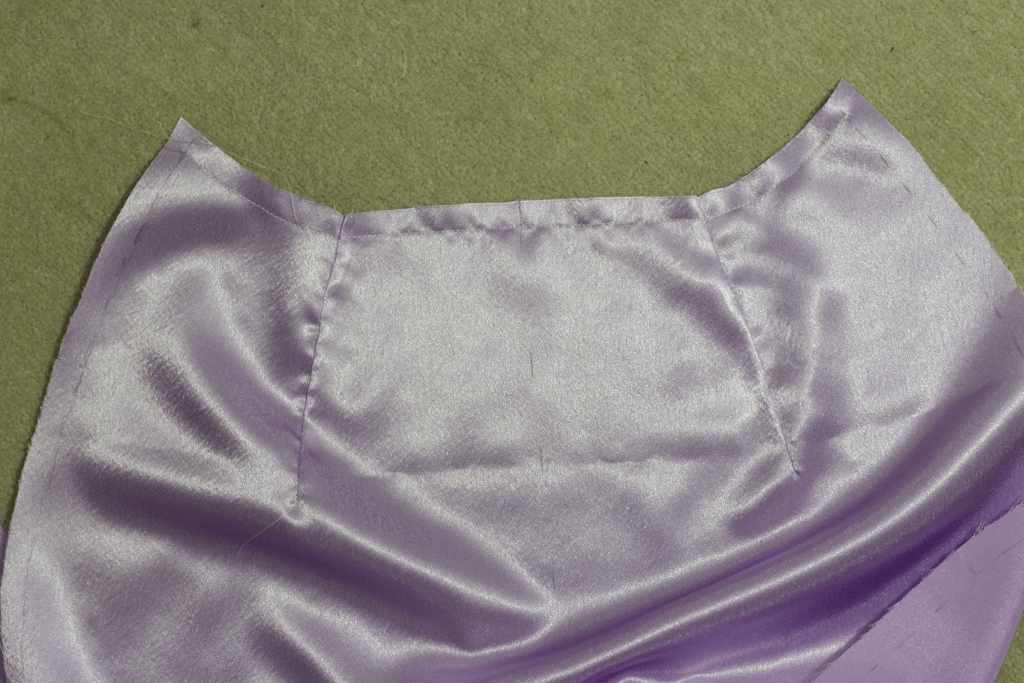 Each seam was hand-basted, and I learned that on curved seams it helps to (1) used a short stitch length and (2) do a little back-stitch every so often. This is because the running stitch still allows the fabric to slide a little, especially if you’re dealing with slippery satin.