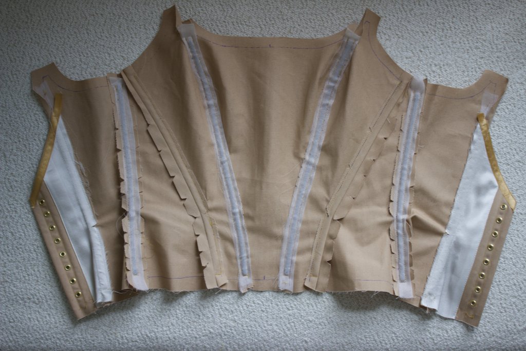 I used spiral steel boning in all my seams apart from the boning on either side of the CB eyelets. For those I used rigilene. I bought continuous spiral steel that I trimmed to size, capped with metal caps and sealed off with nail varnish. Some people use electrical tape to seal the boning, which I’ve heard worked well, but I personally just didn’t like the idea of putting plastic caps into my dress. The metal caps can be bulky though, so I made sure to end the boning channel about 10mm from the stitch line to smooth things out.
