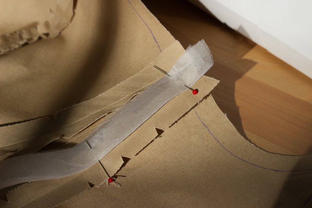 I projected my pattern pieces and marked them up with a heat-erasable dotted line. I found that little dots were best for marking the stitch line as it doesn’t drag the fabric out of place. All my seams were hand-basted first, especially the princess seams. Whereas a running stitch is usually used for basting, I found that an occasional backstitch was critical so stick the fabric sliding around. Then I used a short machine stitch on the old Singer given to my by my husband’s nana. This old, stable machine did a fantastic job and it a beautiful humming sound as it stitches. I trimmed and clipped the curved seams as often as needed. Clipping the princess seam shallow and often helped maintain a smooth finish.