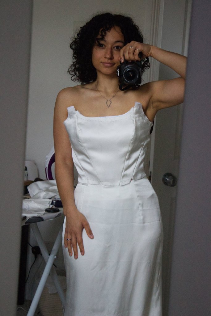At the end of my satin work I had two skirt layers, an outer bodice layer and a lining for the corset. At this point I could pin it together and get a first glimpse of the dress.