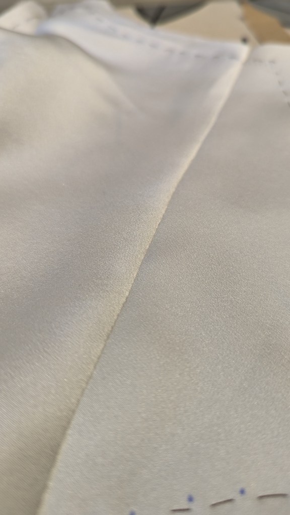 At this point I thankfully knew my pattern pieces very well because despite the bodice underlining, the fabric was still very slinky. Hand-basting every seam is – in my opinion – obligatory here as it doesn’t just stop the pieces from moving but also prevents them stretching on the seams. Trust me, I tried to take a short cut with a seam on the lining and it did not work out.